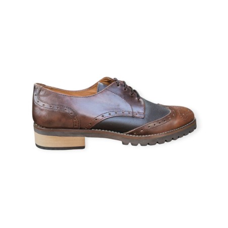 Zapatos de Señora elaborados en serraje marròn con  estilo blucher, con puntera redondeada labrada y cierre de cordones frontal . Incluye suela de goma en color negro con tacòn y troquelado decorativo.