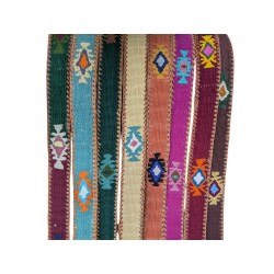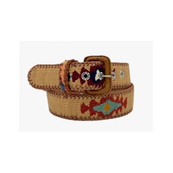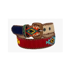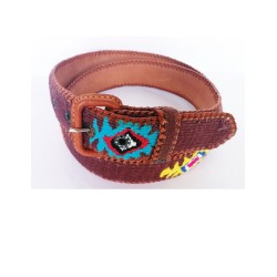 Cinturón étnico elaborado en telares a mano de algodón 100%. Terminación en piel vacuna.. Bordes trenzados artesanalmente.